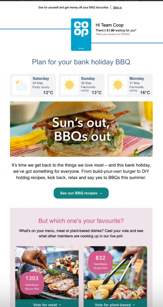 The brand embedded a live poll in its emails, paired with a progress bar. The voting percentages updated with each email open. After the poll ended, it sent a highly targeted follow-up email within 24 hours.