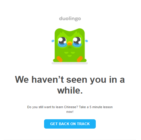 In addition, the email is made even more personalized and heavy by asking the user if they still want to learn the language they had planned to learn. In my case, Duolingo asks if I’m still interested in learning how to speak in Chinese.