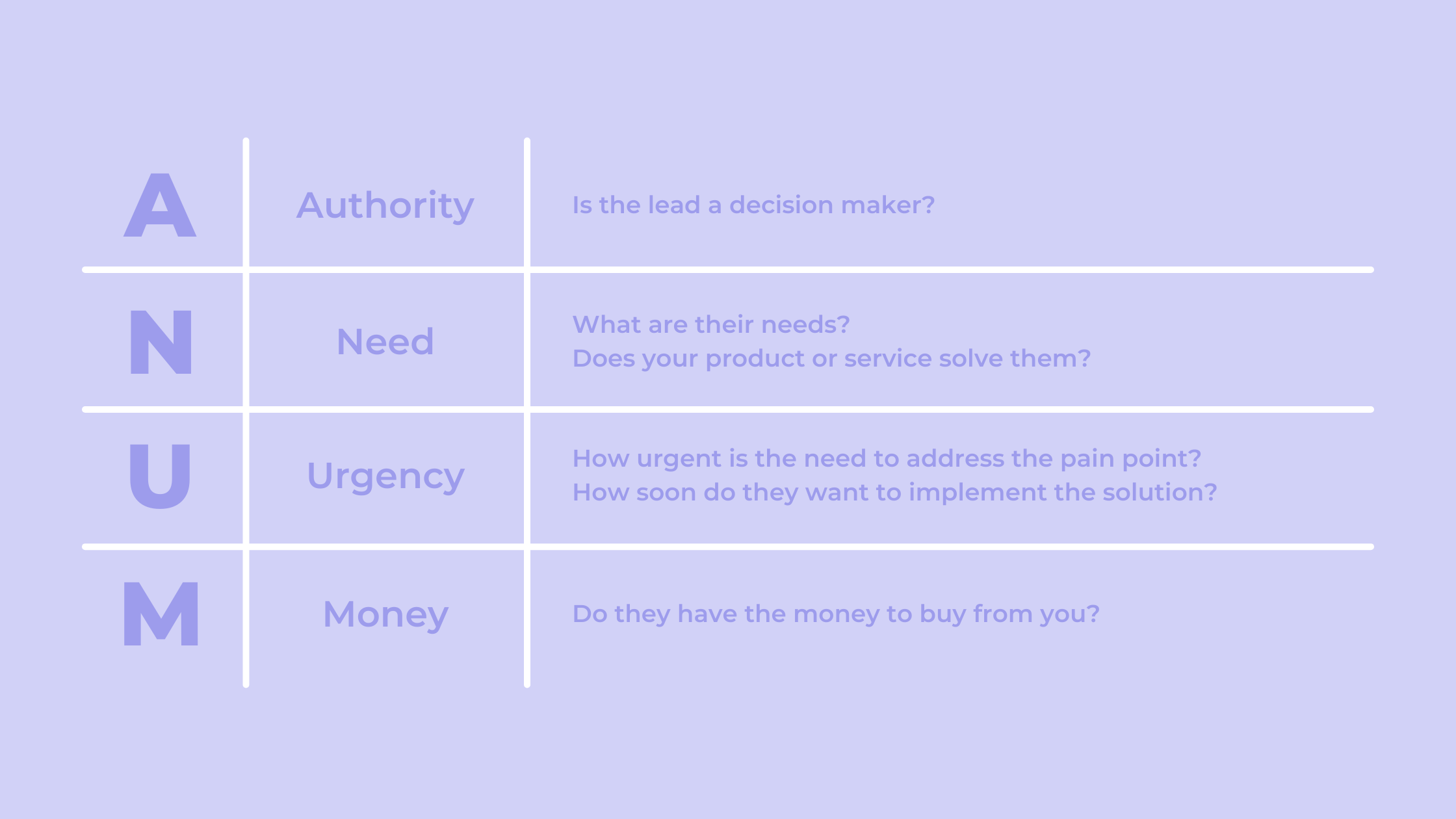 ANUM prioritizes the lead’s role in the decision-making process over their ability to invest in this relationship. It stands for Authority, Need, Urgency, and Money.