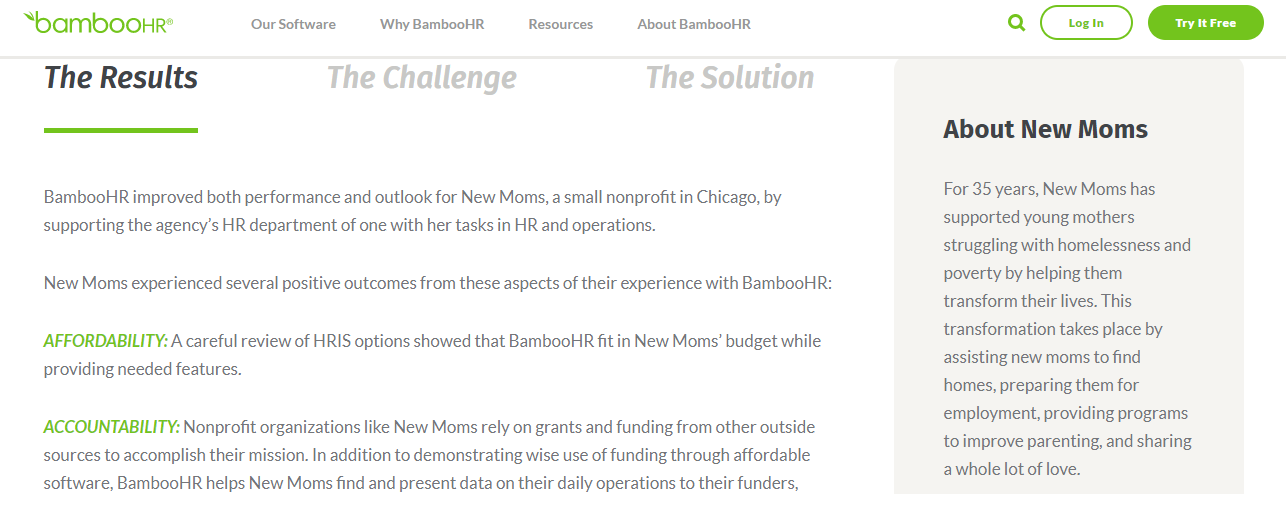 The company, which sells human resources software, doesn’t just copy and paste a testimonial from one of its satisfied customers. It explains the customer’s detailed journey before and after the use of the BambooHR software. You’ll even find a sidebar that details who the BambooHR customer is, New Moms, and what exactly it does. If you scroll above, you’ll see a picture of the HR director at New Moms and her video testimonial. Because there are many details to include, BambooHR even dedicates one entire website page to this New Moms case study.