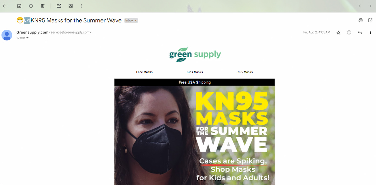 The email from Green Supply is a great example of lead engagement. The subject line, “KN95 Masks for the Summer Wave,” immediately captures attention with a timely topic, and uses a combination of emojis and concise language.