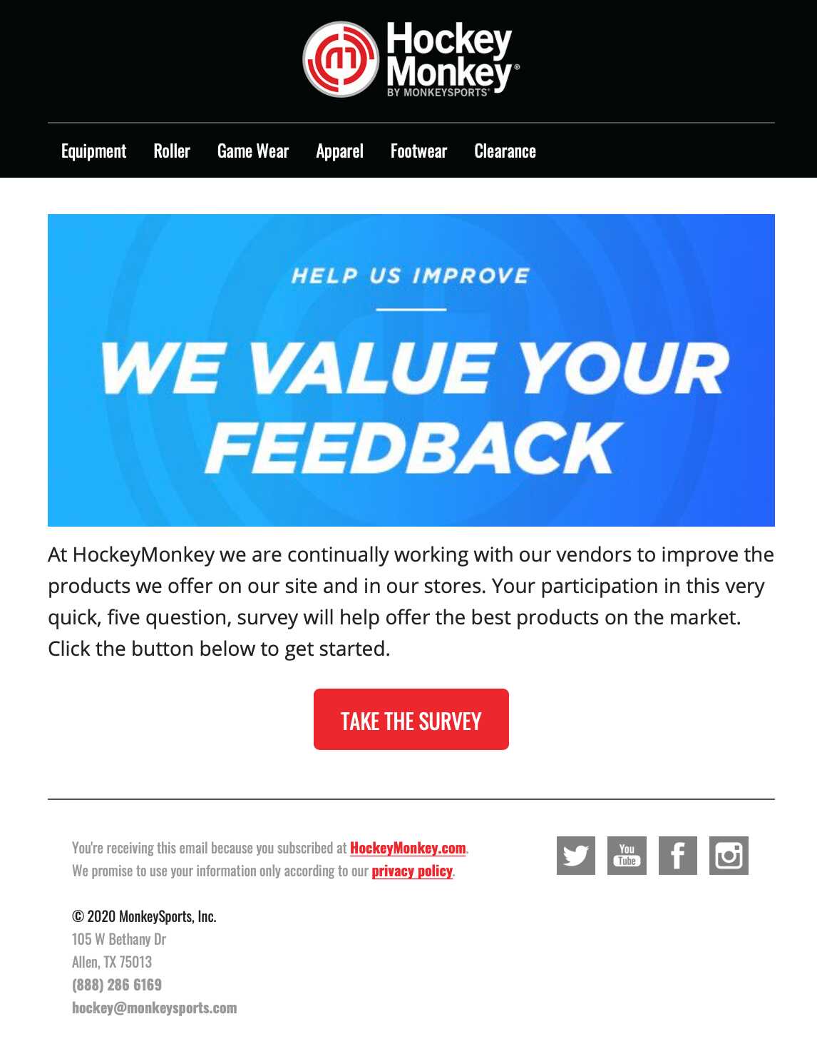 Not only should you create a well-designed survey, but you should also know how to promote it via email. Here’s an example from Hockey Monkey to illustrate: