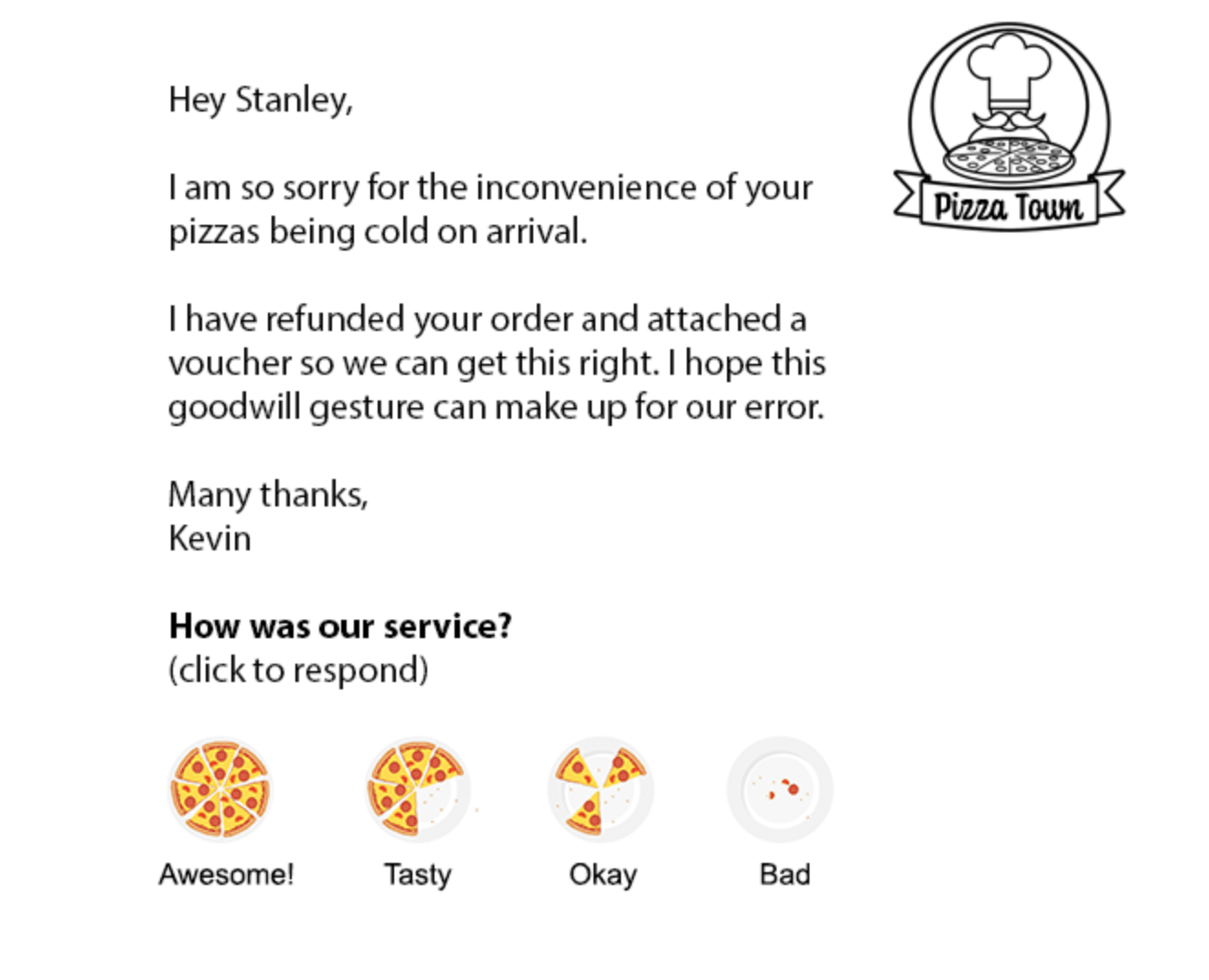 Check out how Pizza Town used a creative approach when asking about customer satisfaction: