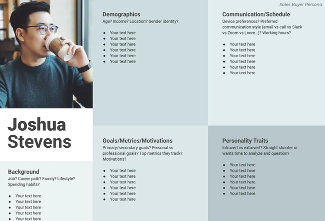 - Find a free template, like the one below, to simplify the process of creating your buyer personas. A good template helps you systematically organize key information about your leads, like their pain points.