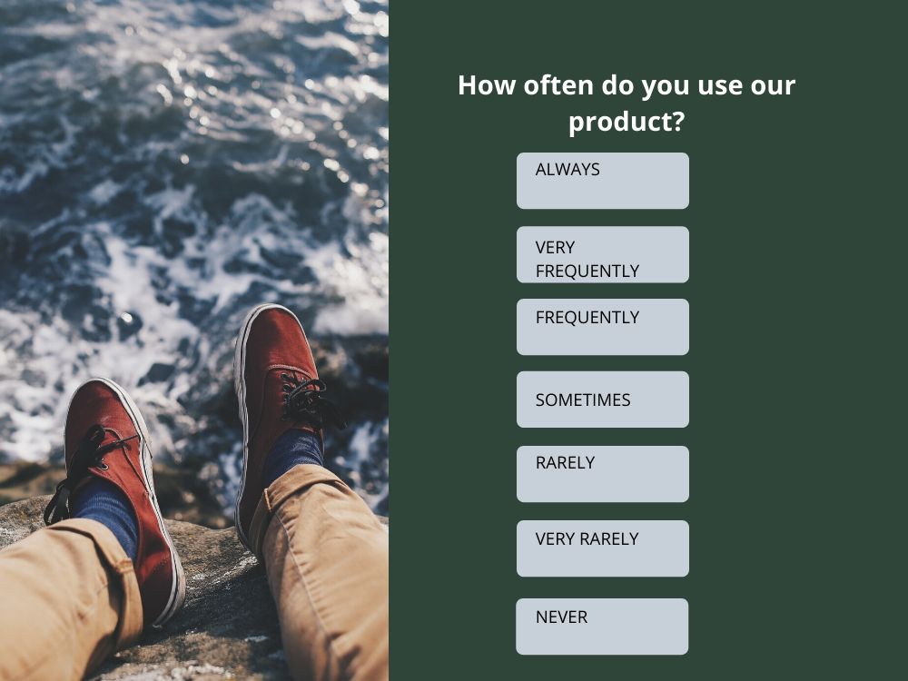 This scale determines how often an action is performed or how often something is considered. It gives you insights into how important something is in the customer’s routine or workflow. Always, very frequently, frequently, sometimes, rarely, very rarely, never.