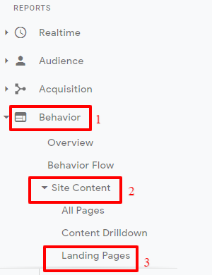 Step 2: Choose the correct property (if you’re tracking more than one website) and click behavior > site content > landing pages.