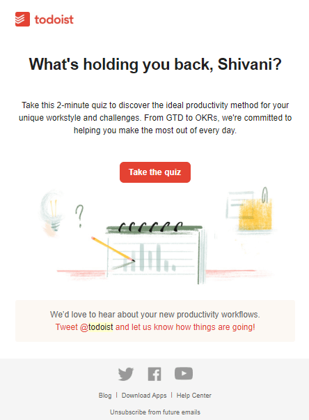 Over time, many of your leads turn into cold ones because they did not find value in your emails. In order to convert them into warm leads, consider sending a re-engagement email. Here are two amazing examples from Todoist.