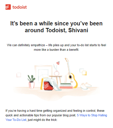 Taking the example of Todoist, here’s a snapshot of my inbox. Todoist has been sending me emails on a daily basis. I signed up on their website quite recently. They are sending me blog resources and encouraging me to make my to-do lists through Todoist for free.