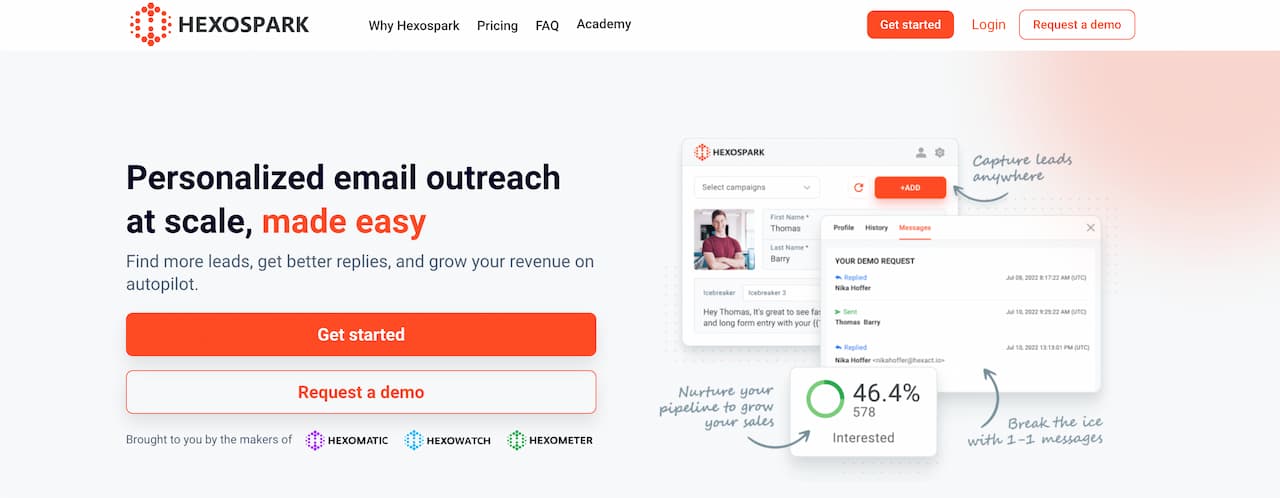 Hexospark is an all-in-one email outreach and CRM platform making it easy to find leads on LinkedIn, send, create perfect email lists, send hyper-personalized email campaigns, and more.