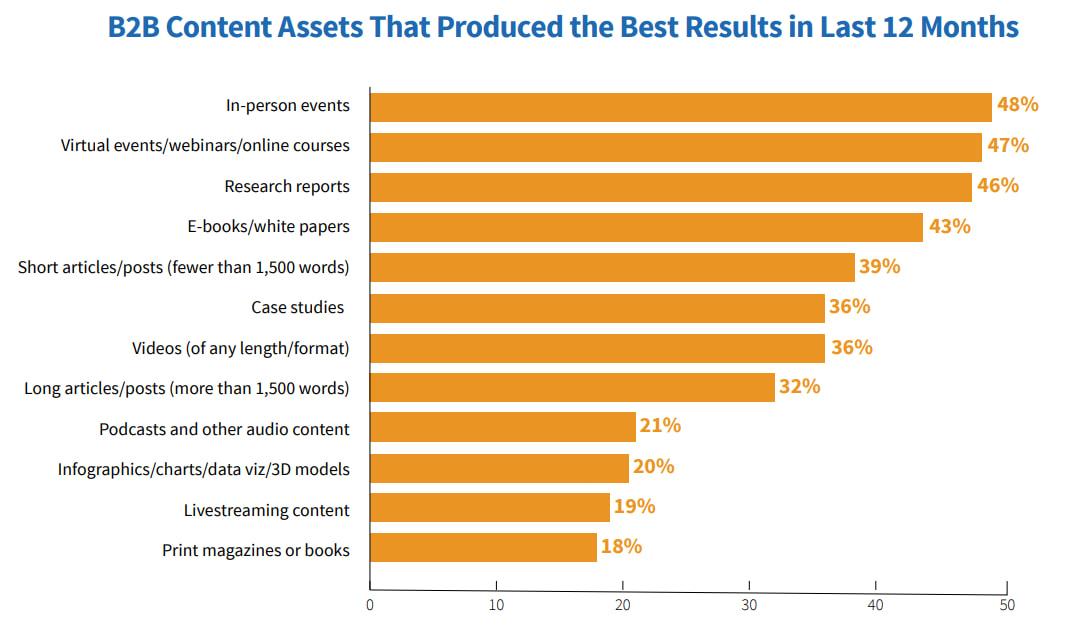 B2B audiences consume content across a variety of channels and formats, so it’s essential to choose formats that resonate with your target audience and match your objectives. The most common forms efficient for B2B lead generation include: