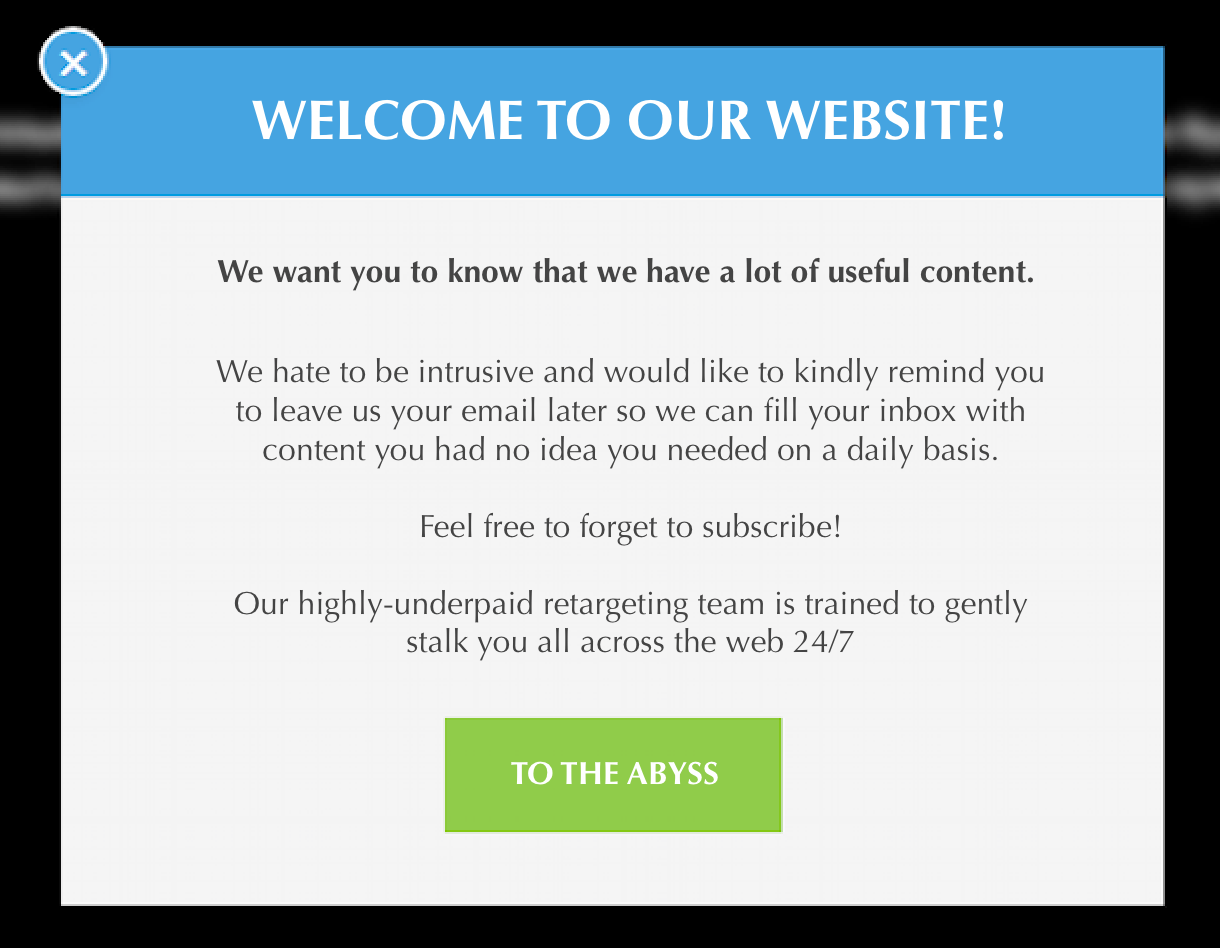Oh, the email popups… and the exit intent popups… and the chat popups… all wanting to take info, only to give value… somewhere else, sometime later, after jumping through some more hoops…