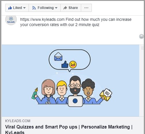 When posting to your Facebook page, Facebook itself will pull the description and featured image from the page you embedded your quiz on. That may give you something that looks like this: