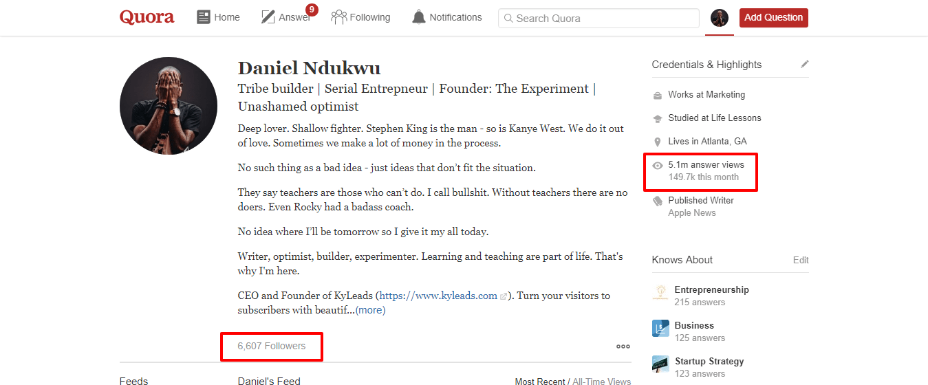 I’ve been active on Quora for a few years and have over five million views on the platform. I actually hang out there and have a lot of fun doing it so answering questions and linking back to KyLeads was a no-brainer.