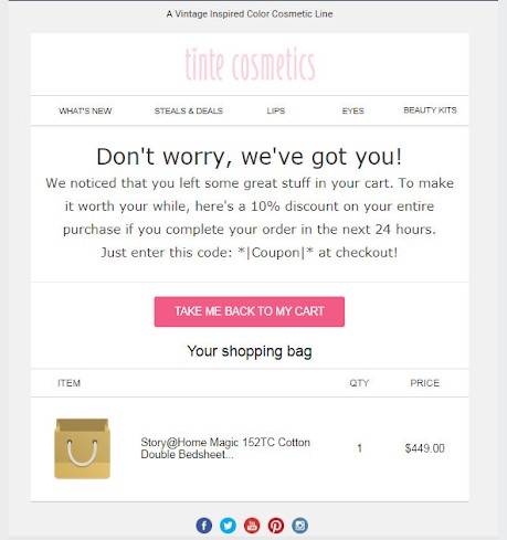 Cosmetics company Tinte Cosmetics offers a 10% discount incentive for those who abandoned their cart. However, they also create urgency by informing the potential buyer that the promo is only effective for 24 hours.