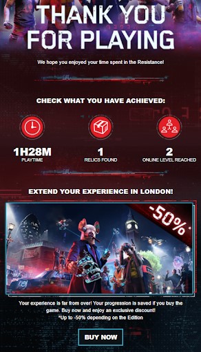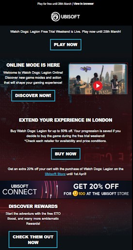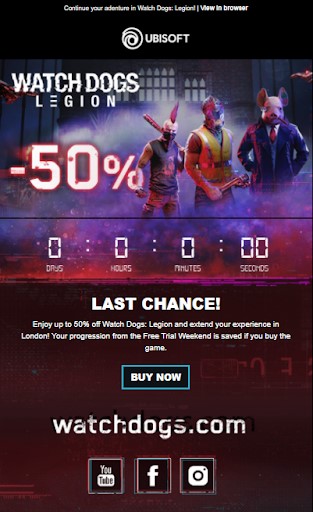 Going back to the earlier example where Ubisoft had sent promotional emails to players, they also sent upsell emails to those who participated in the free weekend of their Watch Dogs Legion game.