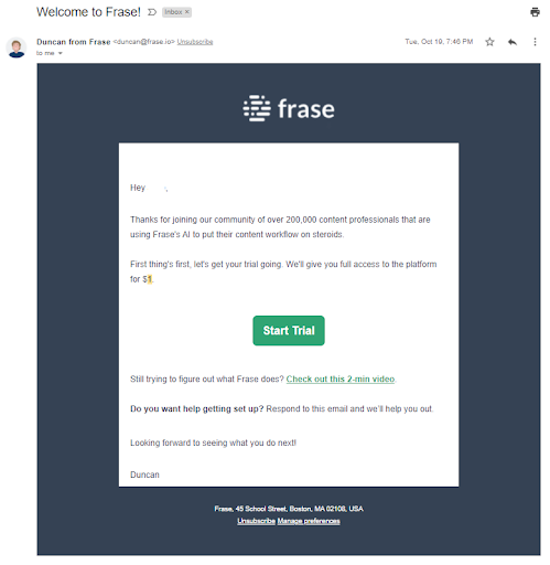 When you sign up for a trial of Frase, an AI-powered writing platform, you receive the welcome email above. It thanks you for joining the community of Frase users, offers you a $1 deal for full access to the platform’s features, and gives you a link to a video that teaches you how to use it.