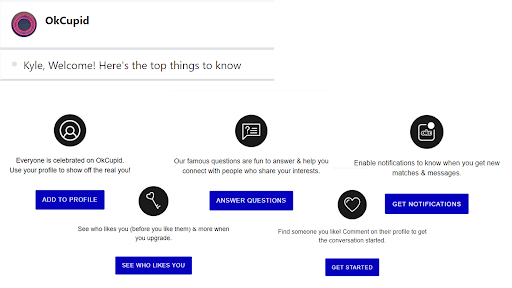 Since users who are greeted with the welcome email usually don’t know much about the business yet, it’s a good idea to give them a general overview of your service in this email. Just like what OKCupid did.