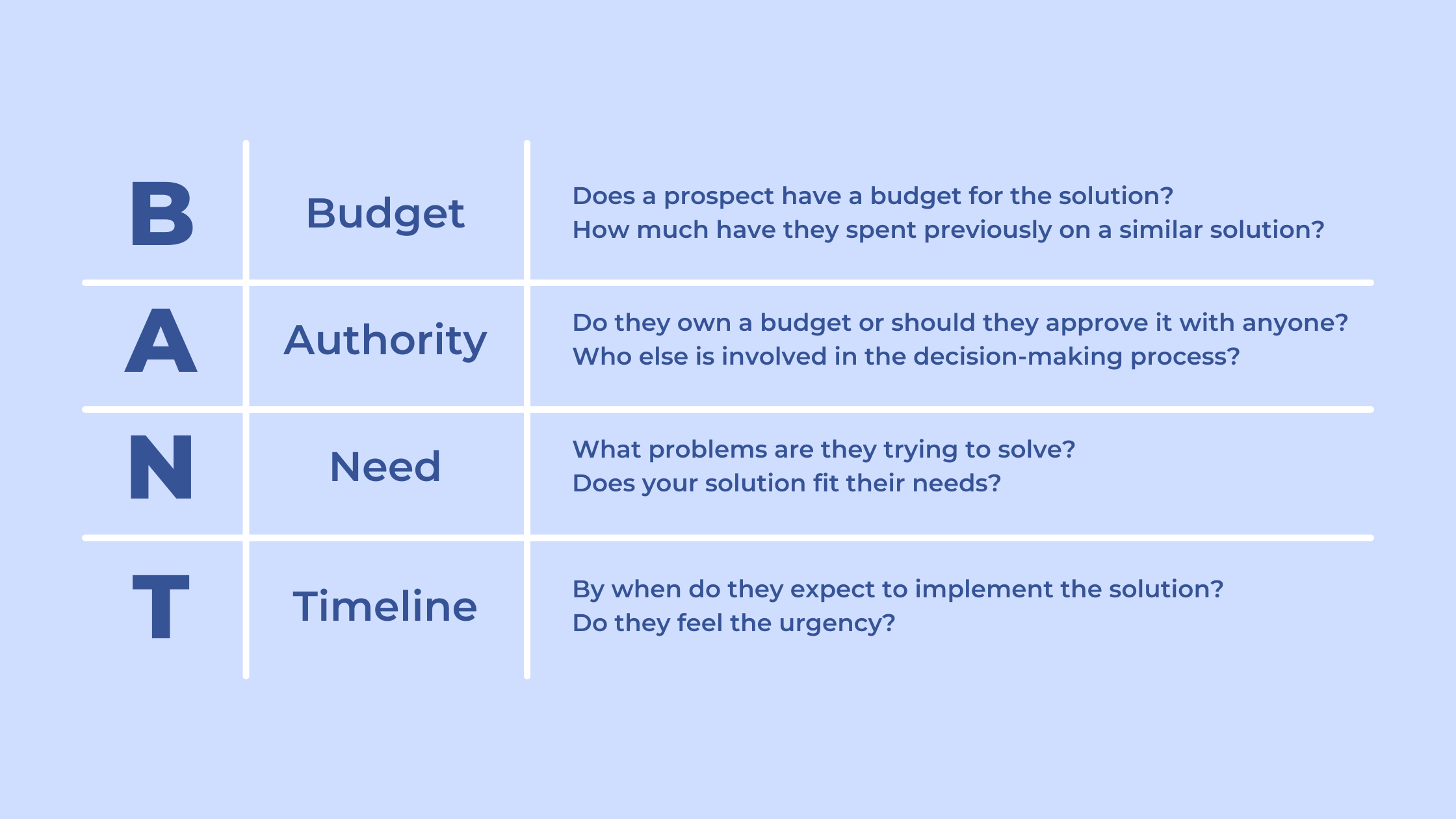 BANT is an abbreviation that stands for Budget, Authority, Need, and Timeline. The words composing the name of the framework are the basis for qualifying questions, such as: