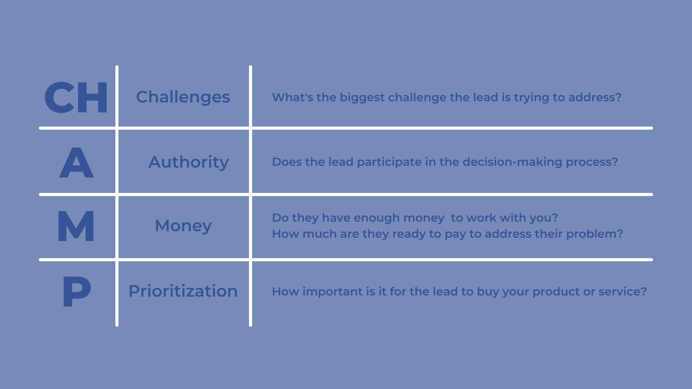CHAMP stands for Challenges, Authority, Money, and Prioritization.
