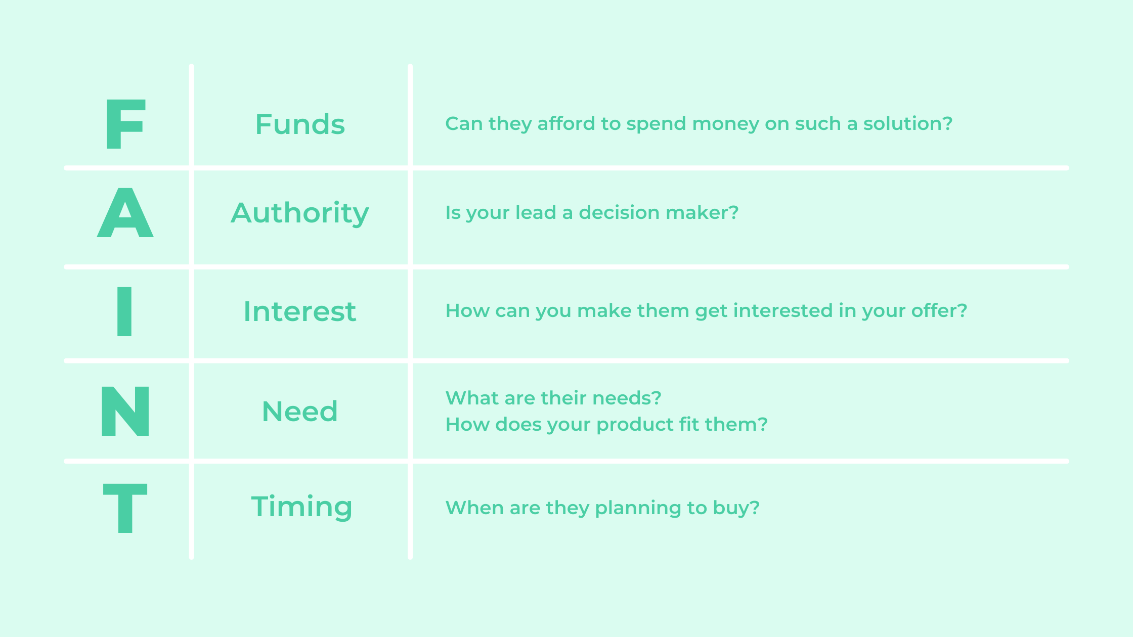 The FAINT framework focuses on aspects such as Funds, Authority, Interest, Need, and Timing.