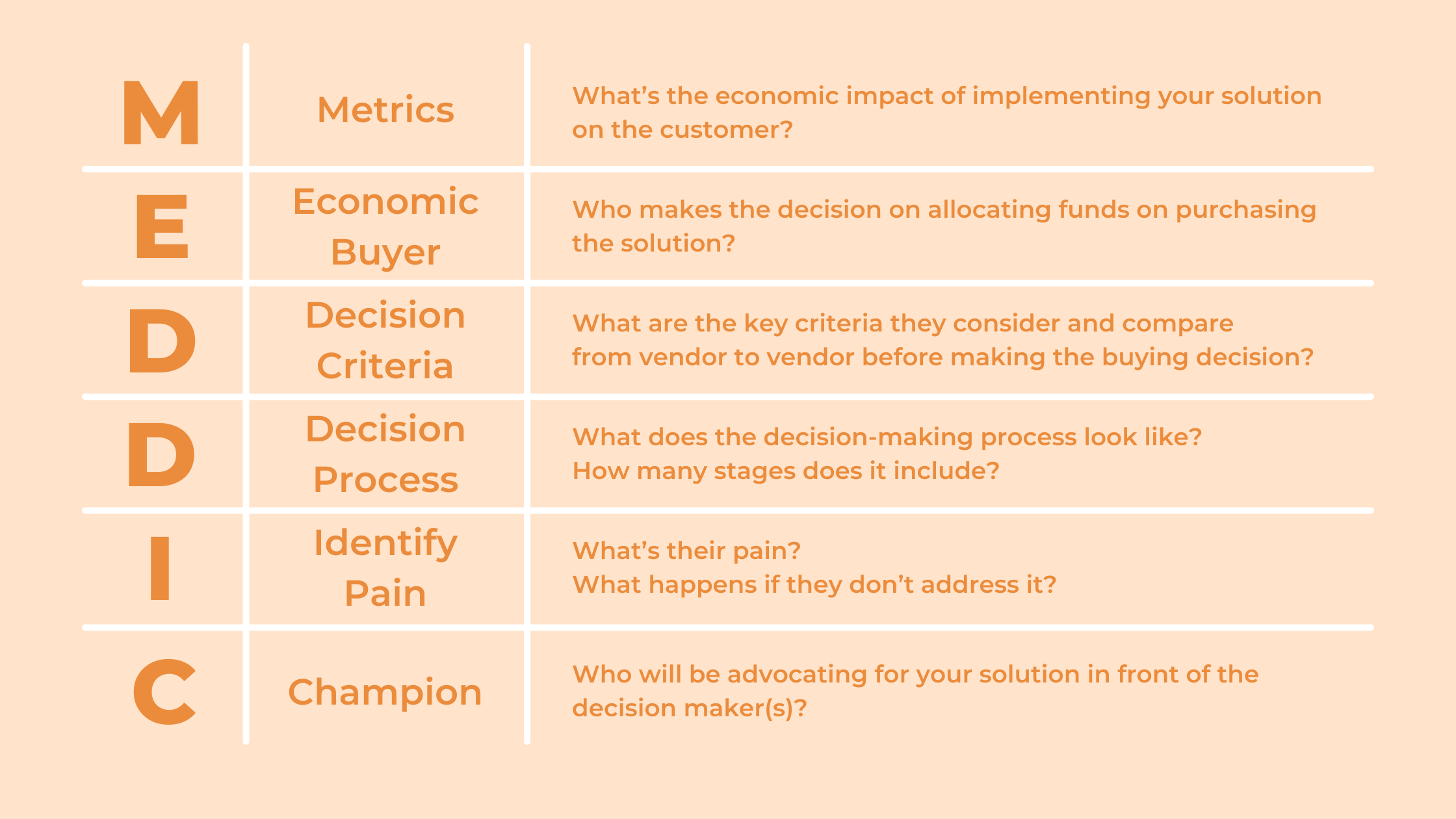 MEDDIC stands for Metrics, Economic Buyer, Decision Criteria, Decision Process, Identify Pain, and Champion.