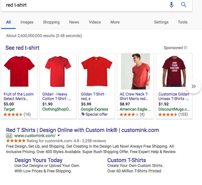 Here is an example of an American Eagle Google shopping ad for the keyword “red t-shirt”.