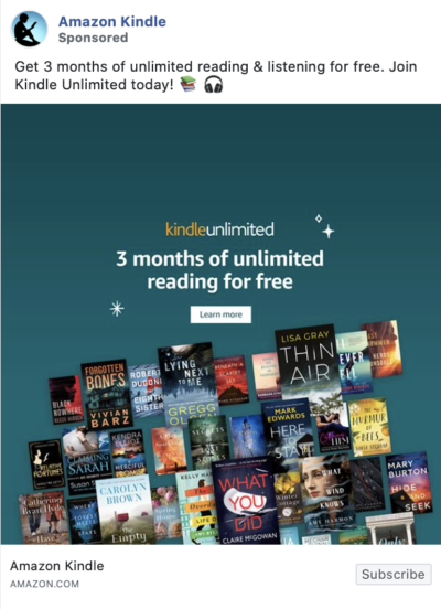 Here is an example of an Amazon Kindle Facebook ad that is offering a limited-time subscription to new users.