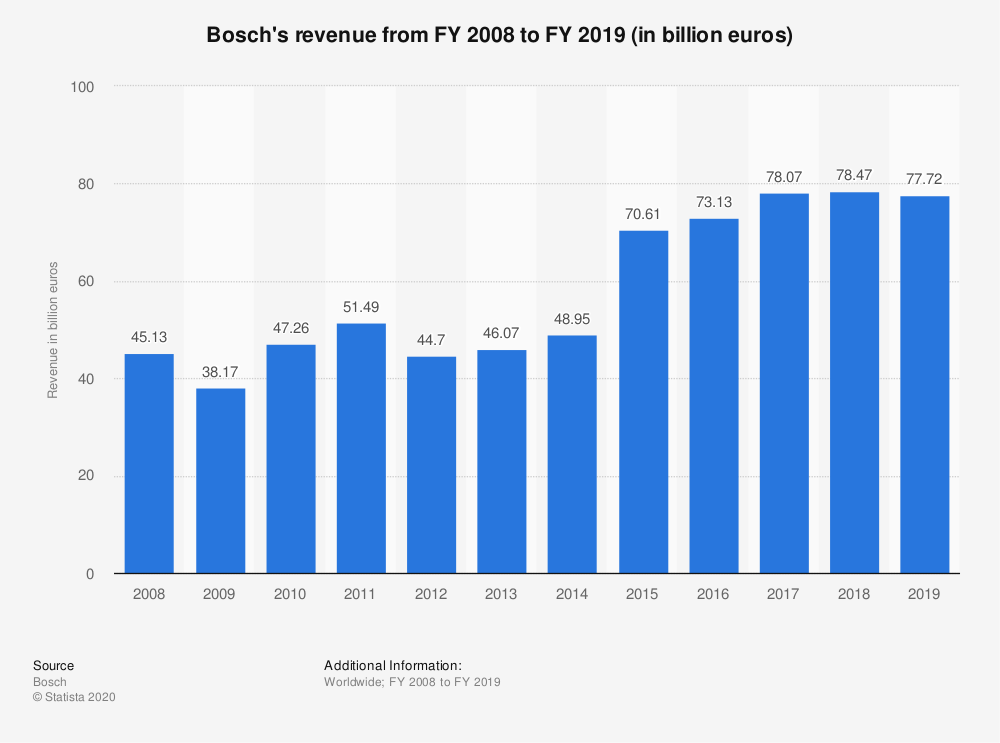 Bosch generated over 77.7 billion euros in the year 2019. And the figures are enough to speak up for themselves.