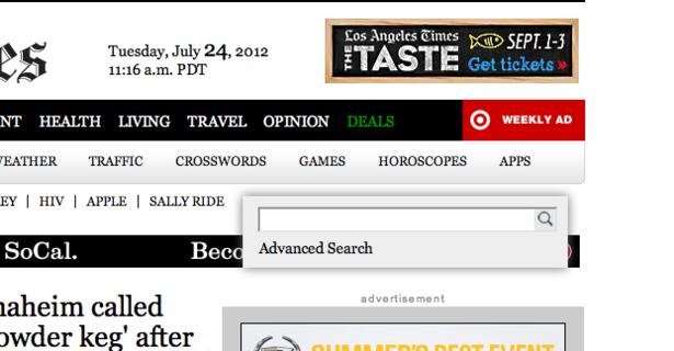 The LA Times links to advanced search options as soon as you begin to type in a query. (HT: SLI blog for the example).