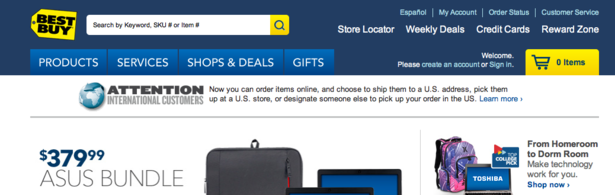 Most e-commerce sites place the search box near the top of the page, above the main navigation bar, as in the example below from Best Buy.