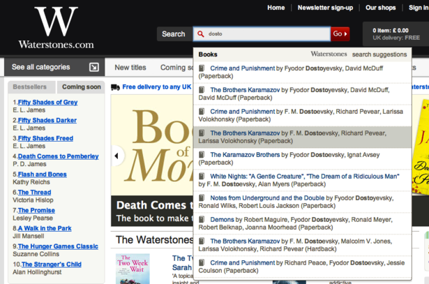 In this example from Waterstones, shoppers who can’t remember the spelling of a famous Russian author’s name only need to get the first four or five letters right.