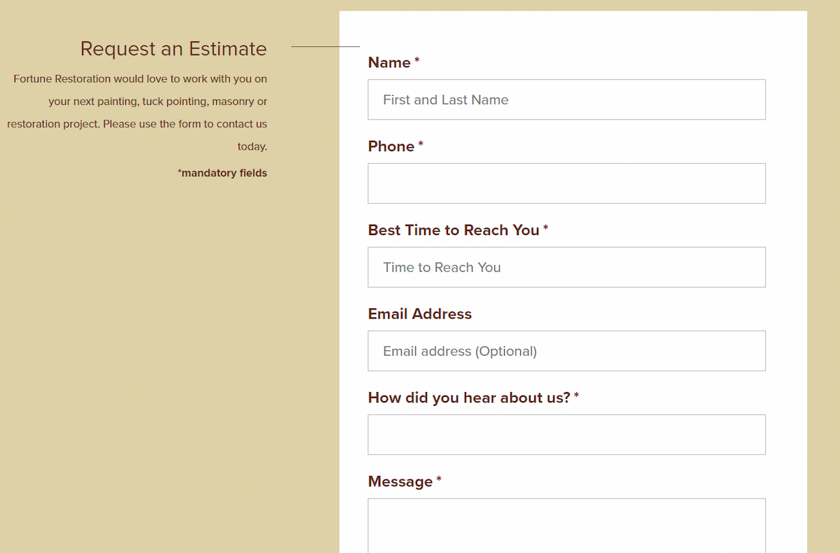 An excellent example of a lead qualification form is the Fortune Restoration “Request an Estimate” form. This form collects key information such as name, phone number, and best time to reach you, so that sales teams can follow up with leads at the right moment.