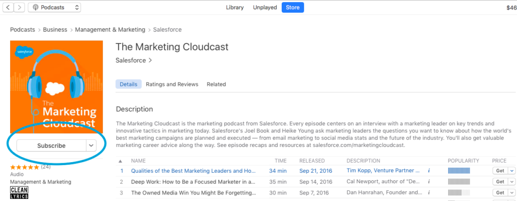 New to podcast subscriptions in iTunes? Search for “Marketing Cloudcast” in the iTunes Store and hit Subscribe, as shown below.