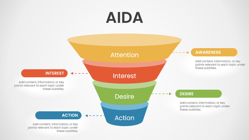 This structured method makes it easier to develop content while providing a logical sequence that advances prospects through the funnel. AIDA proves useful in sales presentations together with email campaigns and landing pages because it effectively guides attention. The framework can be easily implemented through Free PowerPoint Templates which enable marketers to create professional presentations quickly.