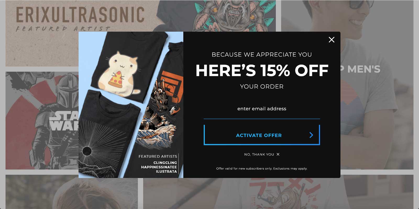 Design By Humans sells t-shirts amongst other goods and offers first-time buyers a discount through a popup box. If you’re a new visitor to the site and interested in purchasing a t-shirt, it’s more likely that you’ll sign up to their email list to claim the offer.