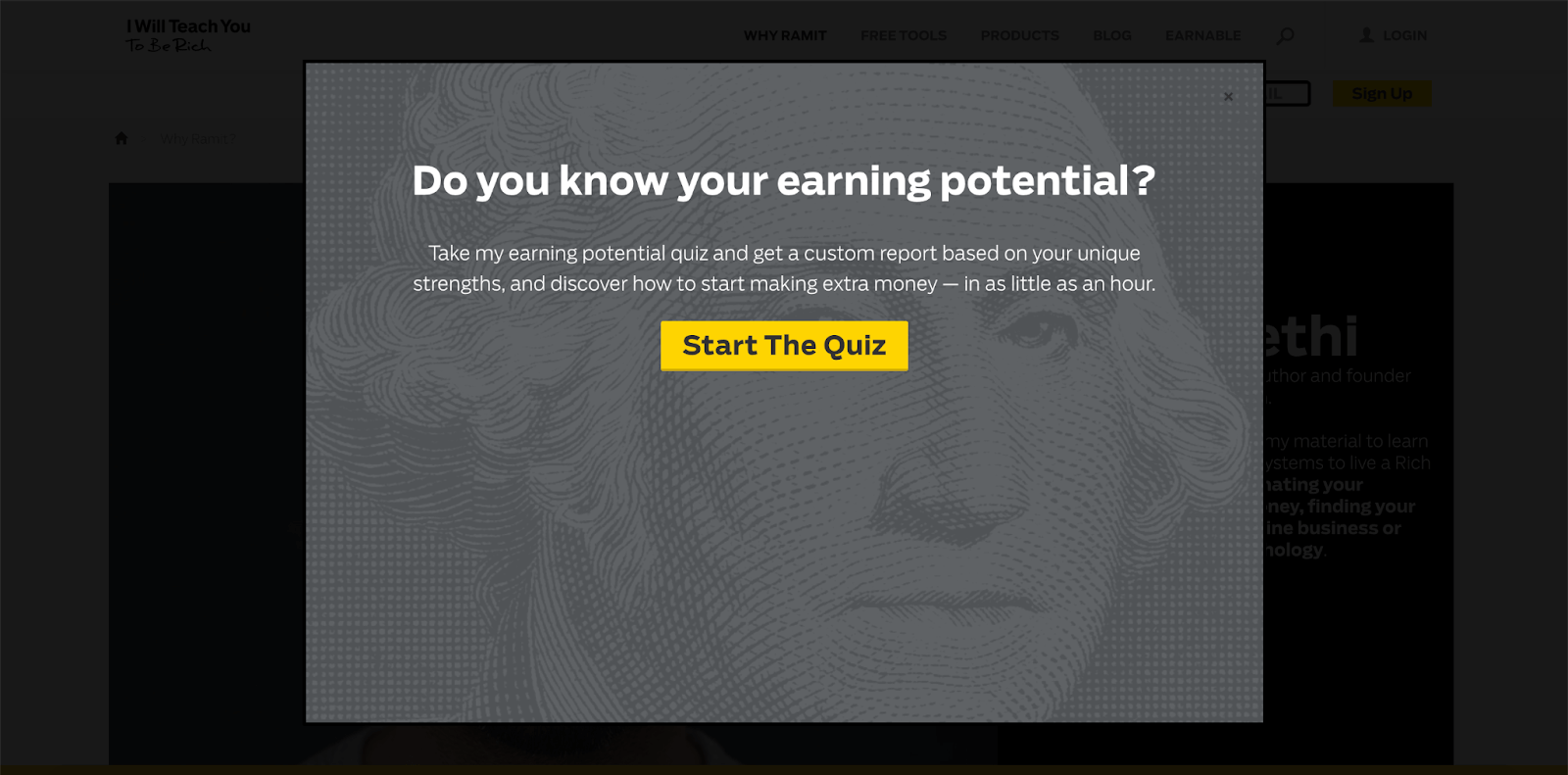 Many well-known companies and bloggers use popup marketing. For instance, here is an example of a popup used on I Will Teach You To Be Rich. The popup tries to get you to complete a quiz. To get the results of the quiz, you need to enter your email address.