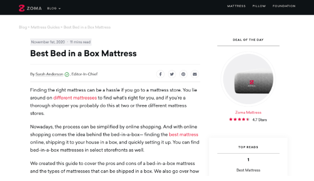 As an example, Zoma drives most of its traffic from organic search because the company is creating content that targets certain keywords such as best bed in a box mattress, king vs split king, best foundation for memory foam mattresses, and so on.